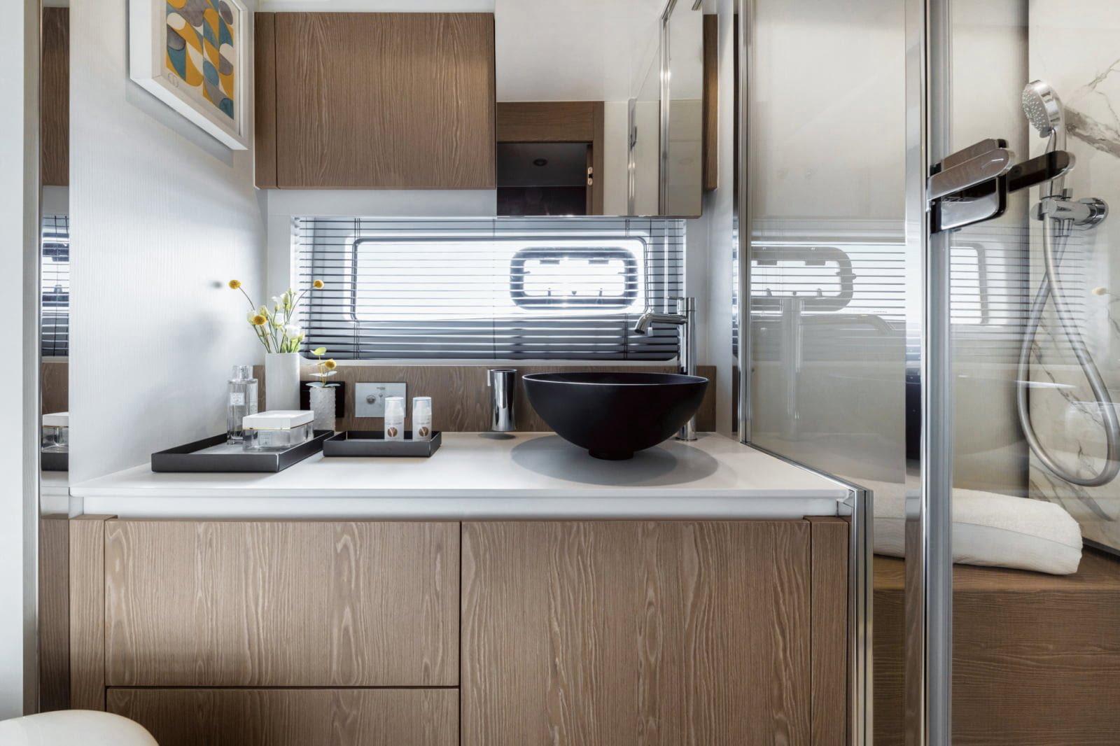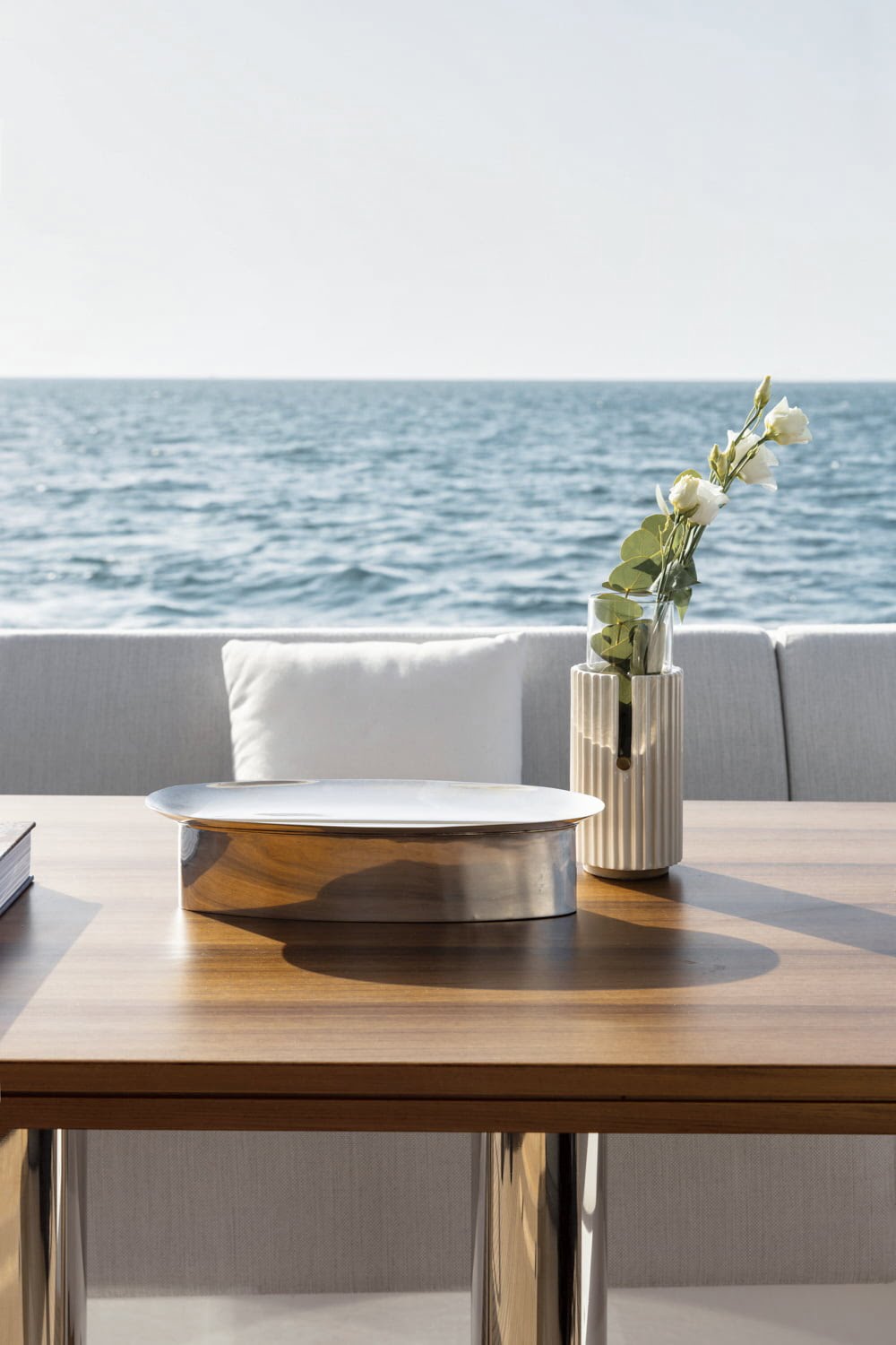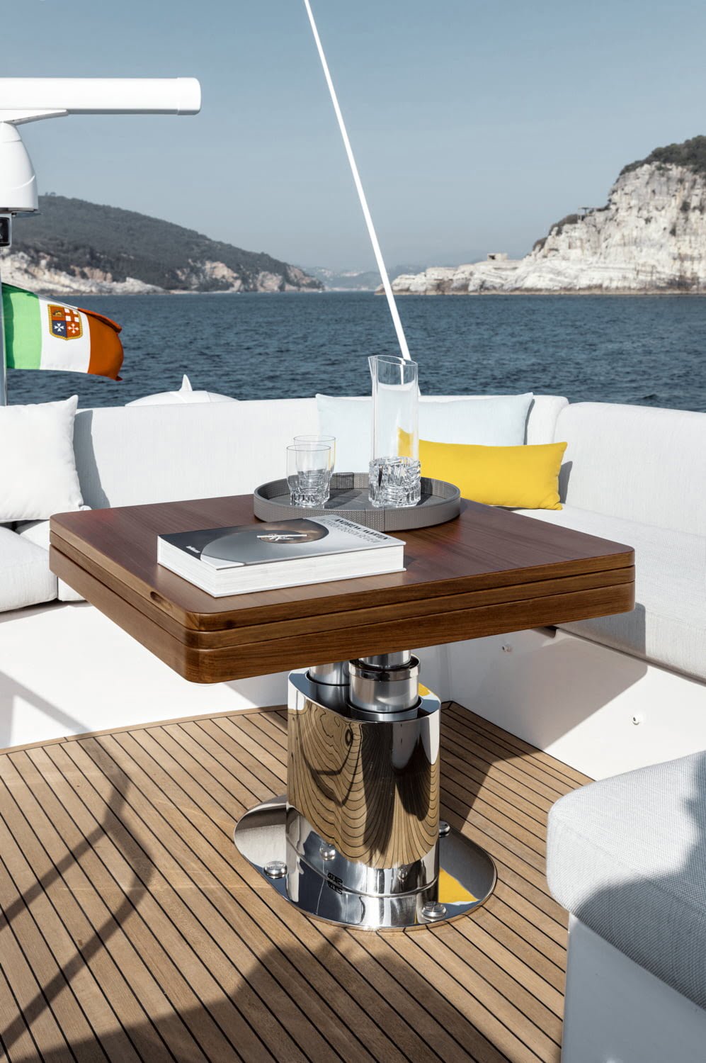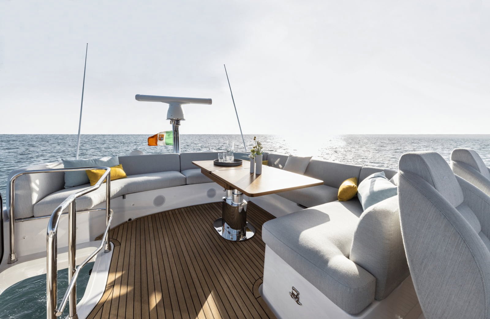 All’esterno sorprendono le numerose aree relax, sia che si cerchi l’ombra o dei comodi prendisole in pelle. Spicca l’ampio flybridge che ospita la seduta di pilotaggio, completa di strumentazione all’avanguardia, una comoda seduta con tavolo da pranzo a scomparsa, ed un minibar refrigerato.