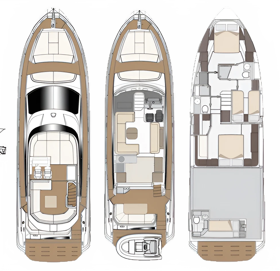• Configurazione Interna: Layout a 3 cabine (Armatoriale a tutto baglio, VIP a prua e cabina ospiti con letti gemelli) più 2 servizi.